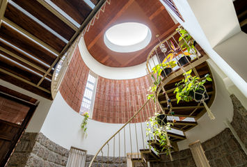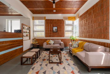 One can gaze into the sky from the oval, as it is fondly called, and watch the clouds slowly sail by while sitting in the comfort of their own home. Hence,there is no doubt as to why the home is named “Ambara'', sky in the local language of Kannada.The stairwell is that moves eloquently through the house designed to ensure that natural light propagates through all floors of the home making it a sight worth seeing. The use of natural materials such as terracotta jaalis along with exposed brick walls, recycled wood and raw pink stone give the home an earthy feel.